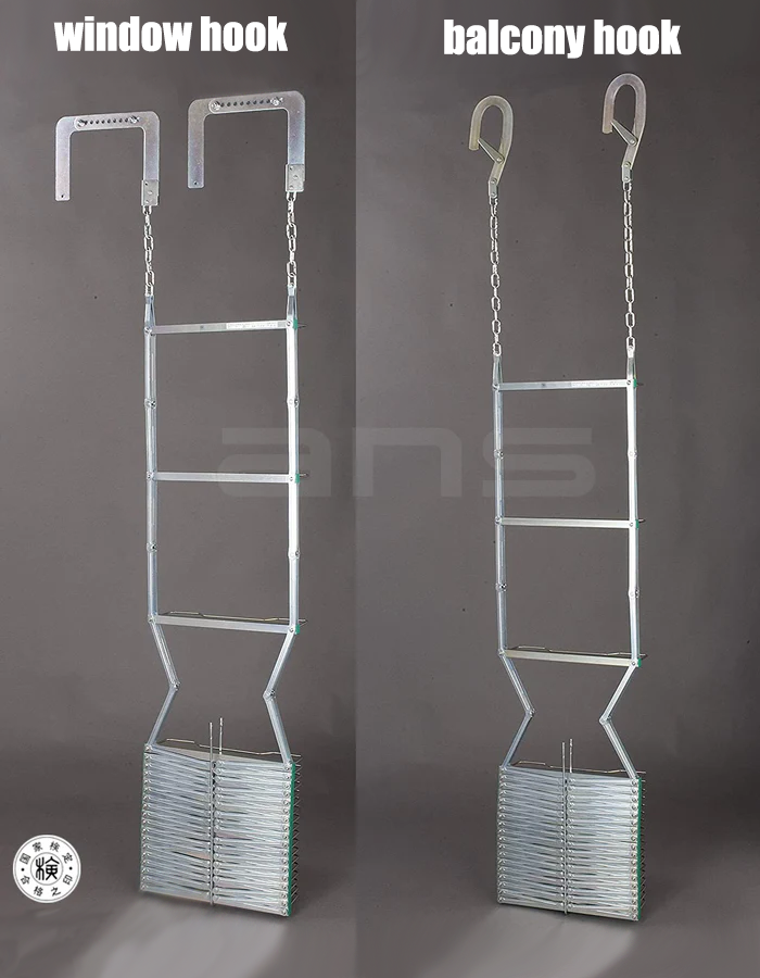 The evacuation route must be pre-determined and the hooks pre-tested and set to the correct size to ensure they fit the window sill or bar on the top of the balcony. The ladder must be stored close to the pre-determined evacuation route.